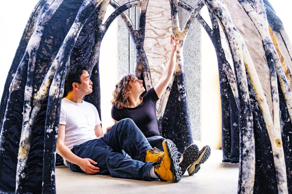 除了测试样本,团队构建了一个更大的圆顶原型称为BioKnit,这是在一块没有关节使用针织模板。这个过程消除潜在的弱点和展示mycocrete的力学性能。