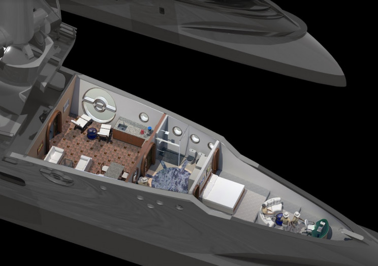 此外,前部有两个主人套房,一间在中央船体开始时,长度为628平方英尺的套房,一间精美的所有者套房。对于客人来说,巨型游艇有单独的客人小屋,可以轻松豪华容纳26位客人。它还可以容纳约20名客舱工作人员,可以帮助浏览游艇的参数,并可以为船上的人员服务。除此之外,还有一个客厅长达5,100平方英尺,有16个前瞻性窗户,您可以通过坐在这个广阔的区域来轻松享受自然风景的美丽。