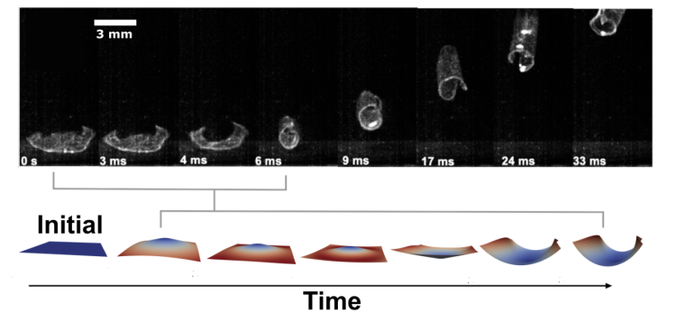 在实验中,研究人员创造了小晶片大小的液晶弹性体的隐形眼镜,放在热板。电影升温,他们开始扭曲,形成一个锥形,起来,直到它突然爆炸内外翻,刺激材料高近200倍的厚度在短短6毫秒。