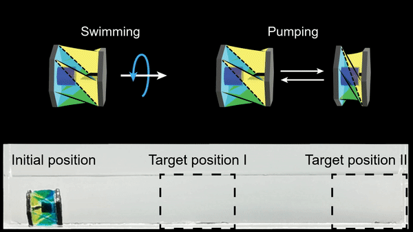 在某些版本中,第二磁体附着在新机器人柔软的圆柱形结构的另一侧。这允许泵送机器人。磁场算子在磁铁之间提供少量的旋转力,从而挤压机器人的薄塑料体。这样做可以使液体从机器人的腹部泵入周围环境。