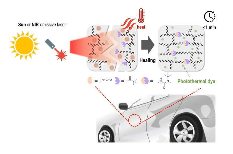 随着开发的材料吸收阳光,表面温度随着光能转化为热能而上升。由于表面温度较高,可以通过重复聚合物结构中化学键的溶解和重新融合来自我修复表面划痕。