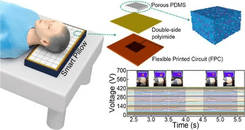 在睡眠监测领域,这些发电机已经被应用到眼罩和床单中。然而,这种新型智能枕头的创造者正在寻求一种限制更少的解决方案,一种不以用户的舒适为代价的解决方案。这个枕头有一组柔韧的多孔聚合物摩擦电层,可以随着头部的运动产生电流。它们被放置在一个普通的枕头上,并根据施加的压力产生电压。
