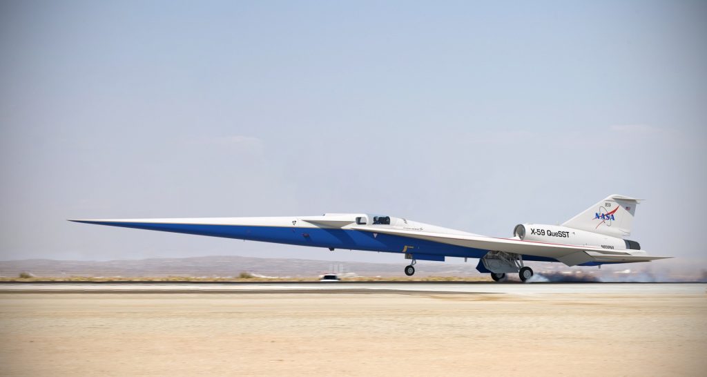 这架名为X-59的飞机既由NASA和洛克希德·马丁(NASA)和洛克希德·马丁(Lockheed Martin)设计和制造,他们旨在使未来的超音速飞行无声,没有吊杆,我们会听到飞行的声音。飞机设计的前部有一个细长且细长的鼻子,它的飞行速度比声音速度快。因此,它在空中升起而没有散发出爆炸性的繁荣。