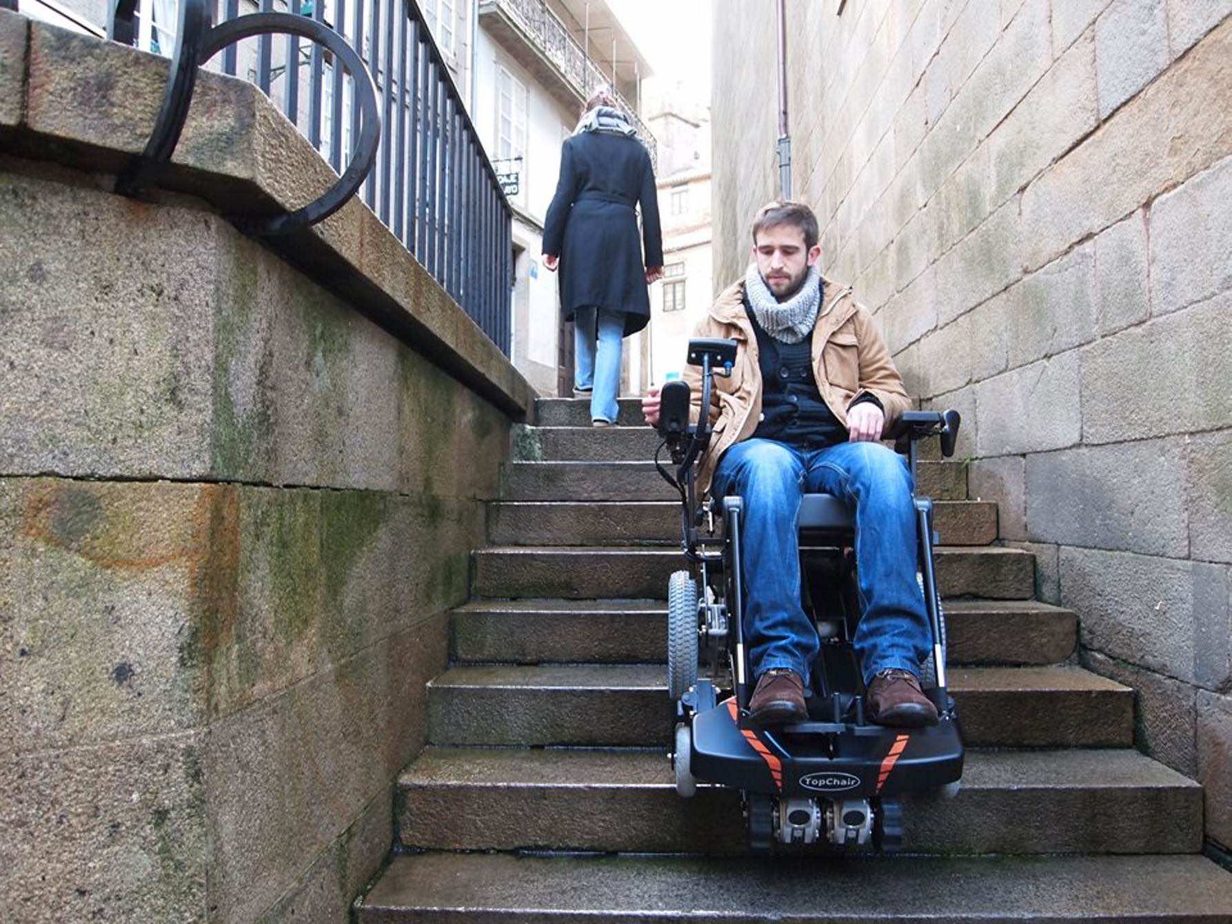 轮椅能够自动确定的开始和结束一个楼梯或其他类似的障碍和能够处理步骤有一个7.9英寸的高度,可以这么做的最大间距35度。向前爬楼梯反过来,面临下行时同时确保用户保持水平。