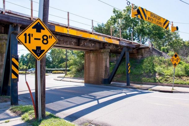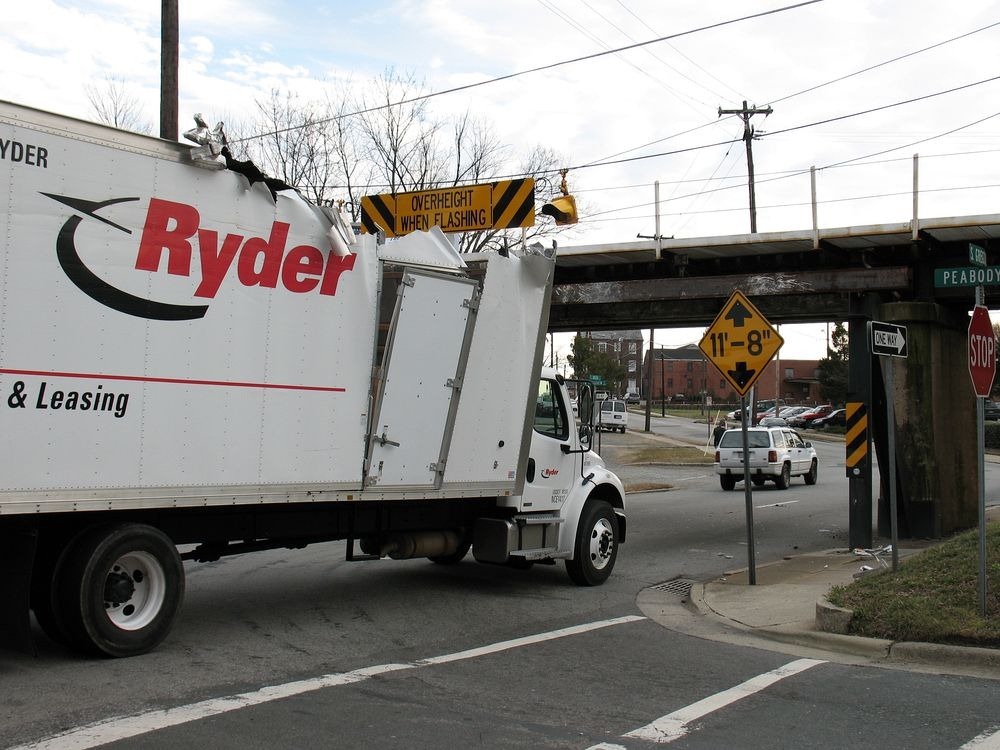 诺福克Southern-Gregson街天桥,位于美国北卡罗来纳州达勒姆站在11英尺8英寸,有点太短。由于这个原因,卡车经常撞上桥屋顶报废掉。这引发了“开罐器桥”的名称。