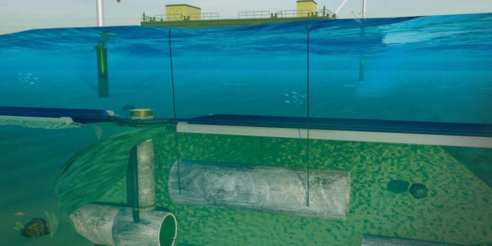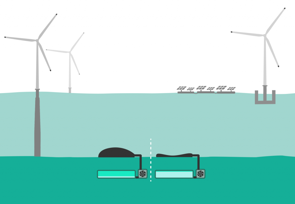 海洋电池是基于水力大坝技术,可以放在一个电力生产源。爱游戏ayx体育多余的风能被送到海洋电池,它将水从地下水库泵入植入海底的膀胱。当需要电力时,水被引导通过水力涡轮机发电,然后返回到地下水库。