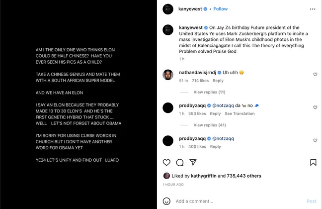 在最近的Instagram帖子中,坎耶称埃隆·马斯克是一个克隆,甚至还引用了前总统巴拉克·奥巴马的例子。