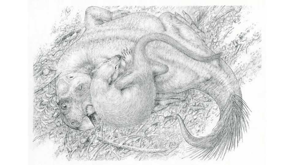 保存在化石在中国东北地区出土,纠缠在一起的Repenomamus的南方,一个badgerlike生物,和一个多,一个食草恐龙,蔑视传统的认为早期哺乳动物仅仅是旁观者在恐龙的影子。