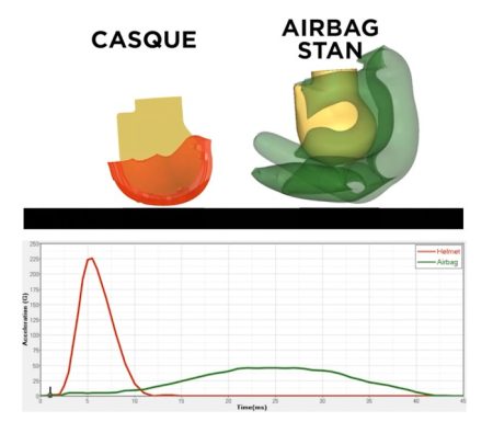 斯坦的基本原理是一种保护性的背包与内部传感器,将部署一个安全气囊,围绕骑手的头部和上半身,当检测到崩溃。它可以用来代替一个头盔,允许乘客保持他们的发型和冷静的头脑去工作或海滩。根据运动,保护水平远优于普通自行车头盔,由于能力保护身体更广泛的区域不受影响。