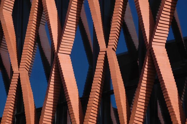 瑞士公司Gramazio Kohler使用了机器人来效果。看来砖块已经堆叠,没有任何粘合剂,就在大型建筑本身旁边。除了机器人的技术外,块的特殊性质也有助于实现不可能的形状。制造商在这些砖的中间结合了一个蜂窝结构,使其轻巧(就像航空航天材料一样)。由于重量减轻,砖可以在粘合接头的帮助下更容易地在彼此之间保持平衡。