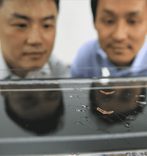 首尔国立大学的一组研究人员和科学家,懦夫在哈佛大学生物工程研究所和哈佛大学约翰·A·保尔森工程和应用科学学院创造了一个机器人能够走在水和昆虫可以从水像水黾飞跃。