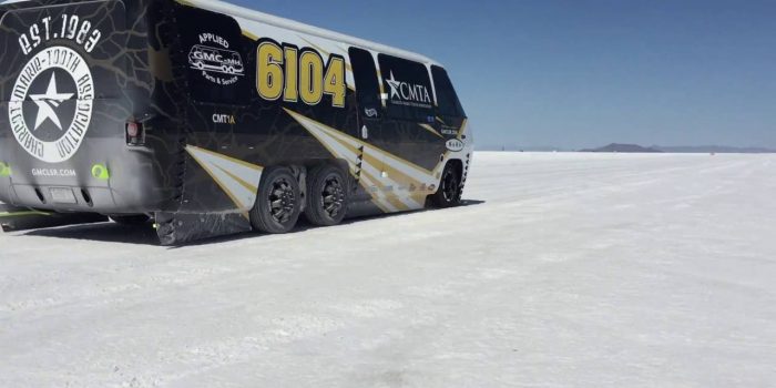 外面,房车收到空气动力治疗,所有六个轮子都配备了现代化的盘式制动器和骑Ridetech空气系统。这些修改打破了先前的陆地速度记录一个类一个房车,与77年GMC达到最高时速122英里每小时。