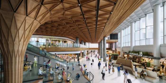 C广场扩张是由考虑到疲惫的旅行者。通过结构,他们将能够发现他们在机场方便。它将增加145530平方英尺(约13500平方米)的餐饮和零售空间,祈祷和冥想,和一个新的航空公司休息室。最显著的特点是它的内部装饰,由当地的启发,将造型的道格拉斯冷杉到复杂的曲线,创建一个引人注目的天花板,以及夹层水平和多个座位区域。