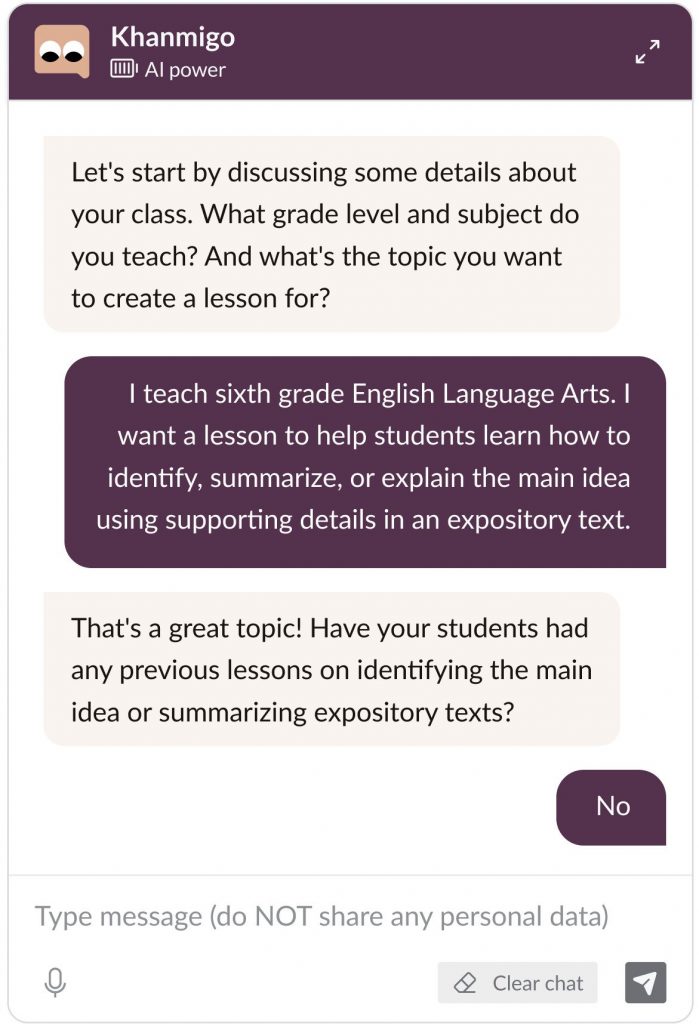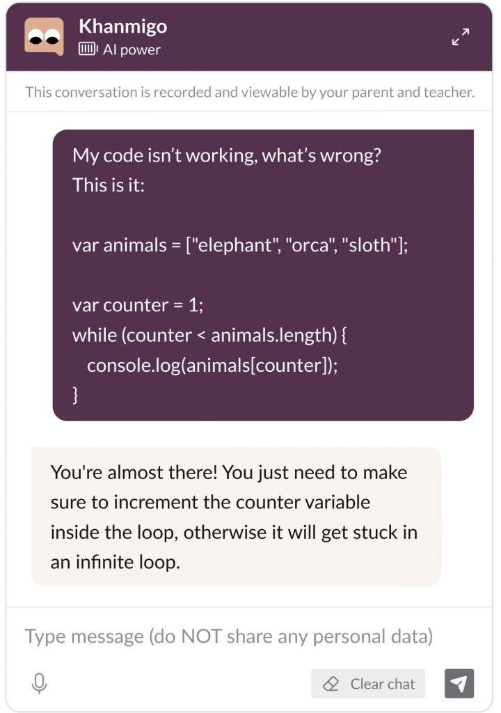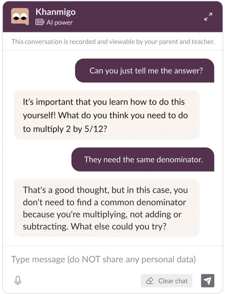 据《纽约时报》报道,Khanmigo在弹出窗口中对一名学生说:“我还是个新人,所以有时会犯错。”“如果你发现我犯了错误……按下大拇指。”