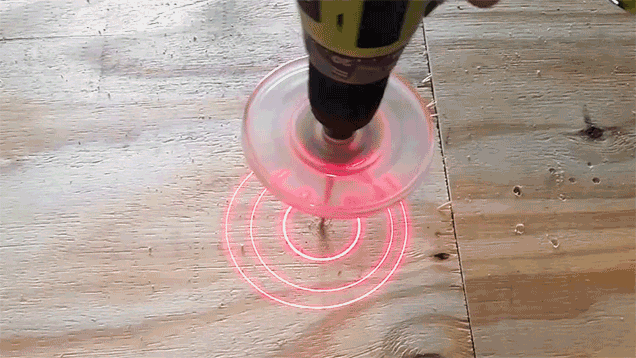 这个概念是由Bullseyebore名称基本上解释了一切。产品使用激光组件生成一组三个同心圆的钻头。钻移动时,圆移动,因此,存在一个明确的圆心瞄准目标。内部的两个圆保持静止但一旦钻动,外圆正在调整显示角度的变化,在必要时,可以采取适当的行动。这是电池供电的,你可以看到它呈现一个no-bullseye的区别。外圆的反馈给了我们一个孔区域的动态视图,防止我们从倾斜的钻。
