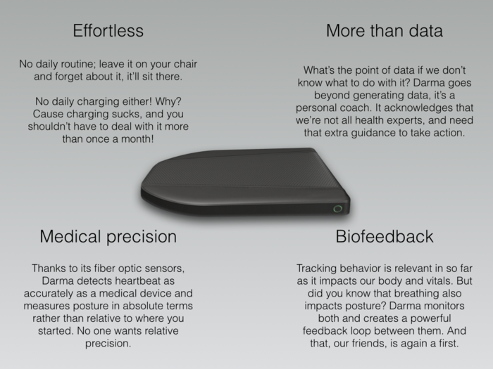 Darma具有1mm厚的光纤传感器,嵌入了多层内存泡沫填充的顶部,旨在改善用户的姿势,同时鼓励他们在坐着和站立之间交替。它还可以检测到用户是否正在闲逛,并通过iOS,Android或Desktop应用程序提供实时反馈和指导,以更好地姿势。靠垫还记录了您坐了多长时间,并在您应该站起来并休息一下以四处走动时通知您。它还跟踪心脏和呼吸速度等生命。根据这些数据,垫子可以检测到用户何时压力并提供呼吸练习以提供帮助。根据用户的坐习惯,垫子可以建议伸展以减轻背部和颈部疼痛等不适。