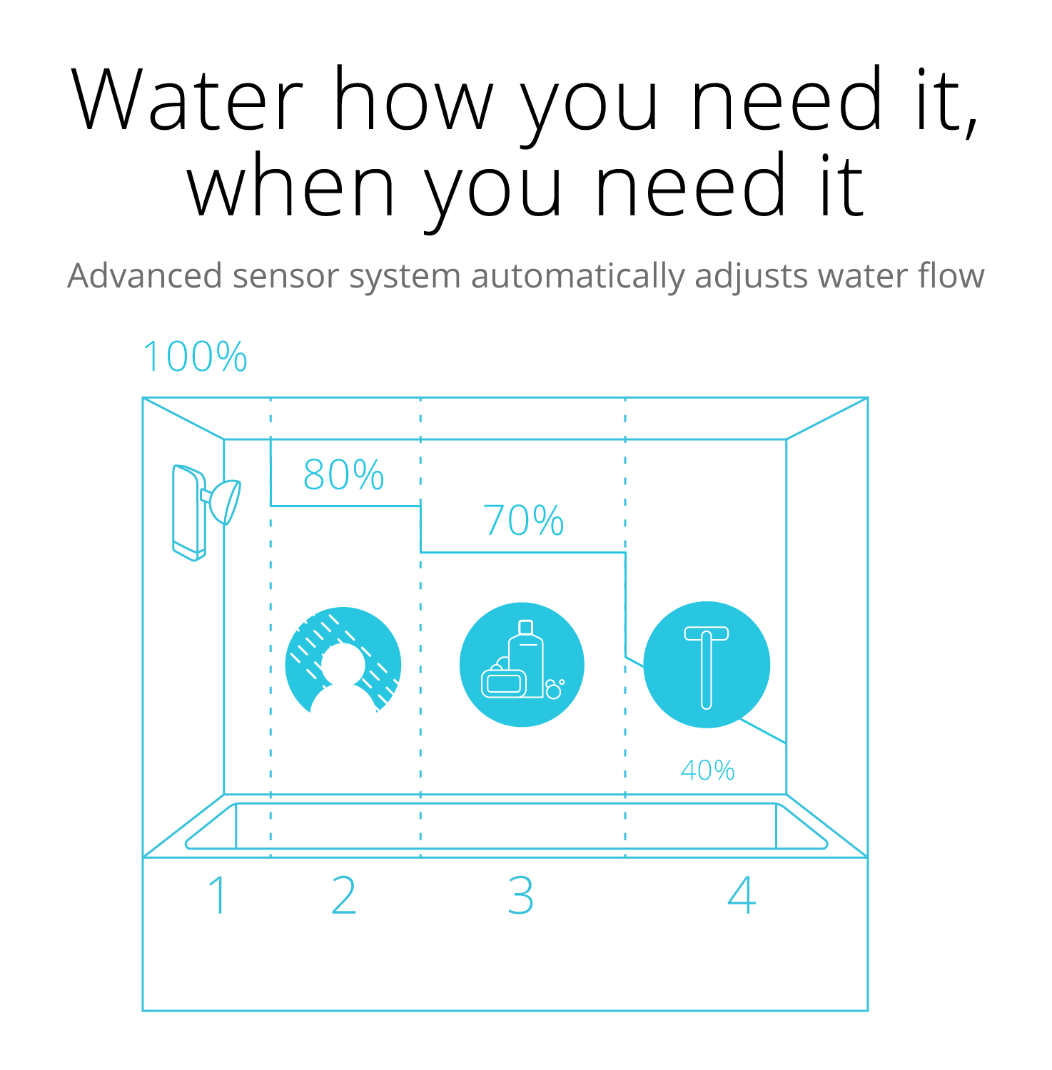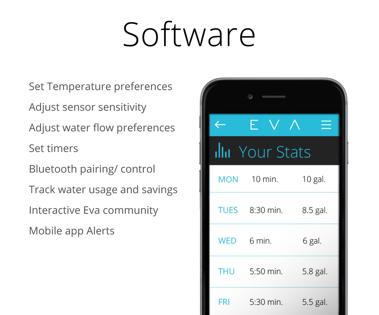 当水开始流动时,Eva会监测温度,淋浴喷头会通知用户当达到要求的水平时。它会关闭水流,只有在检测到用户存在时才恢复。一旦用户进入范围,水射流的强度将取决于用户站在淋浴喷头的位置。这样即使使用者暂时离开,也不会让淋浴器全速运转,从而保证了水的保存。如果你洗澡时间过长,伊娃也会通知你。