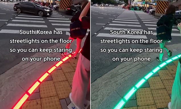 10月11日,来自首尔一个十字路口的TikTok视频显示,绿灯和红灯照亮了路沿,表明什么时候可以安全过马路,即使你在盯着手机屏幕。