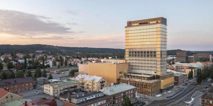 “高层酒店是由预制的3D模型建立的交叉层压木材(CLT),” White Arkitekter说。“低层文化中心是用圆柱和光束建造的粘合的层压木材(GLT)以及CLT中的核心和剪切壁。集成的结构设计已完全从承载结构中完全消除了混凝土的需求,从而加快了建筑物的加快,并大大减少了建筑物的碳足迹。”