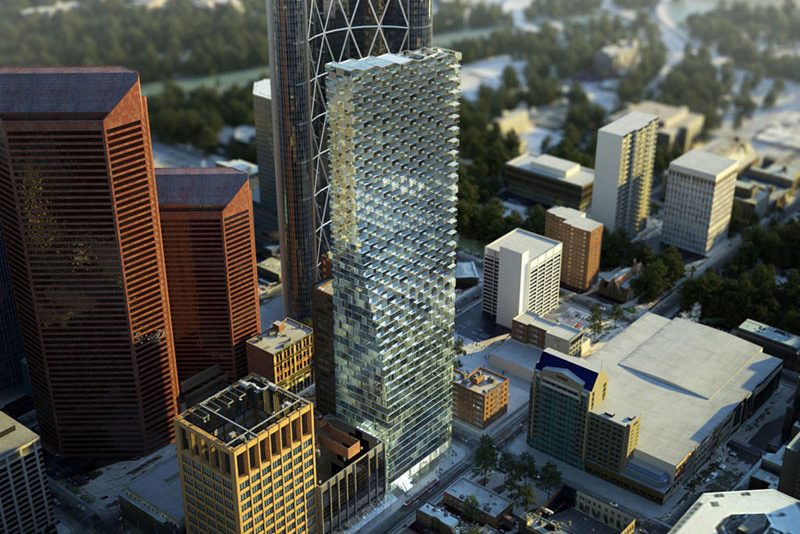 亚军奖的泰勒斯天空塔在加拿大卡尔加里的比亚克英格尔斯集团(大)。magnificent-looking建设上升到728英尺高(222米)和功能一个矩形基础减少规模上升,创造小露台和阳台。建筑照明的LED照明装置在晚上加拿大艺术家道格拉斯·科普兰的作品。