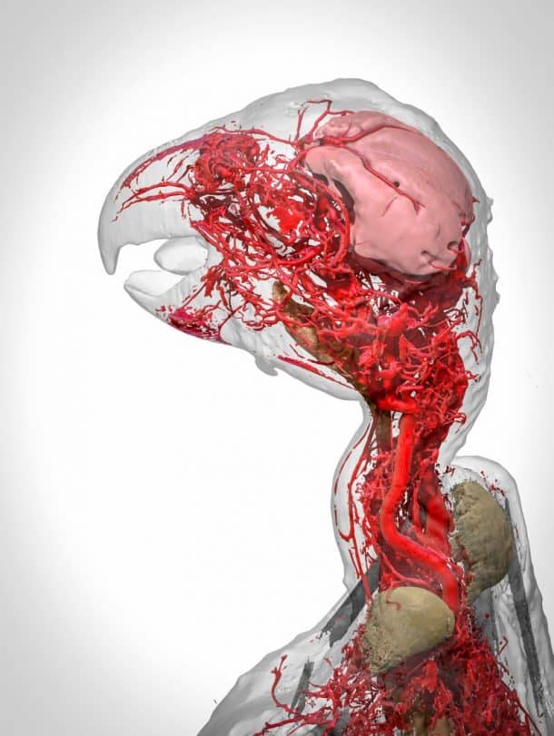 上图是一只非洲灰鹦鹉的3D重建,使用了一种名为BriteVul的新型造影剂。该模型突出了鸟类头部和颈部复杂的血管系统。