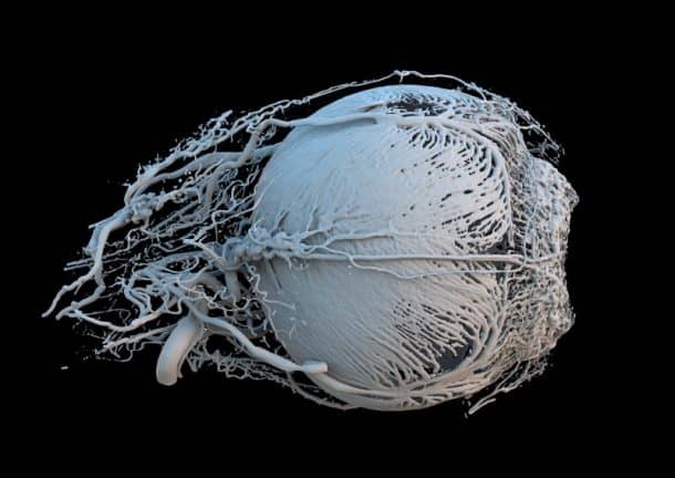 来自瑞士的研究人员使用了极其精确的计算机断层扫描(CT)和3D打印技术来创建这张描绘猪眼睛血管的图像。这些血管为虹膜周围的肌肉输送能量和食物。