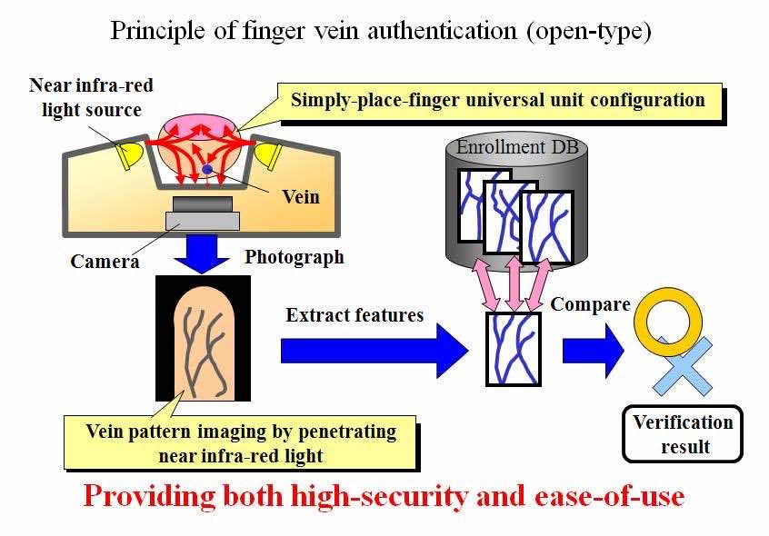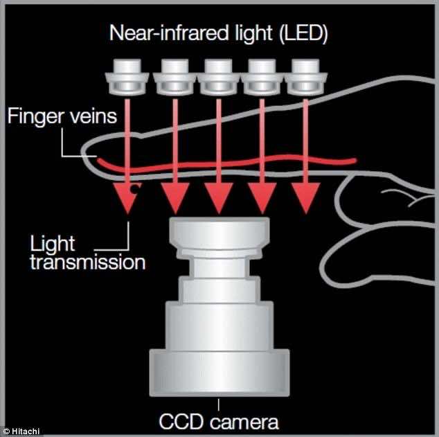 现在是重要的问题;它是如何工作的?使用这项技术的安全性如何?爱游戏ayx体育手指静脉使用CCD相机和近红外光。当放置手指时,近红外光穿过手指,并被静脉中的血红蛋白部分吸收;然后捕捉到这个手指静脉图案。每个人的模式都是独一无二的,然后与数据库进行交叉检查。一旦验证完成,用户就可以访问与ATM机或多或少相似的特性。