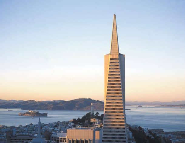 Transamerica金字塔是旧金山最高的摩天大楼,身高835英尺,具有惊人的地震能力。该结构位于与地震振动一起移动的钢和混凝土基础上。建筑物框架的矩形区域具有对角线结构,可为框架提供更多的支撑。在1989年的7.1级地震中,这座建筑震动了一分钟多了一分钟,但站在地面,没有受到伤害和不受影响。