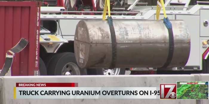 卡车上装载的铀是一种特殊的铀,叫做六氟化铀。这种成分被用来制造核电站的燃料。这是一种腐蚀性很强的化学物质,它会释放出放射性粒子,可以被人吸入、吞咽或穿透皮肤。据北卡州高速公路巡警说,事故中没有任何危险,因为卡车没有泄漏任何材料。