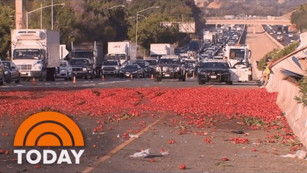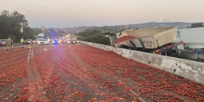 再加上这一点,加利福尼亚高速公路巡逻队为了公众的安全而关闭了高速公路数小时。根据来自洛杉矶时报,“坠机事故发生后六个小时以上,到周一上午11:30,在凌晨11:30之前从东行车道上清理了西红柿。船员使用吸收粉末清理油腻的污垢,番茄和油混合物。但是,一条西行车道一直关闭,直到下午3点左右。当清理工作人员努力拆除半卡车时。”