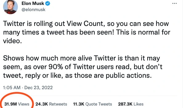 “Twitter推出视图数,所以你可以看到一条微博多少次了!“这是正常的视频,”Elon Musk在推特中写道。“显示多少活着比看起来Twitter,当超过90%的Twitter用户读但不要推,回答,或喜欢,这些都是公共行动。”