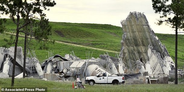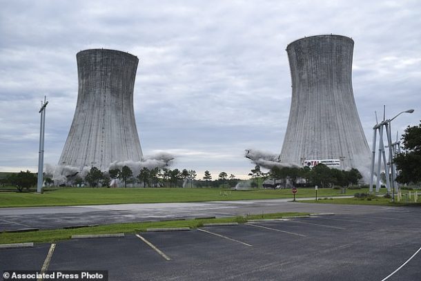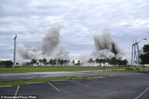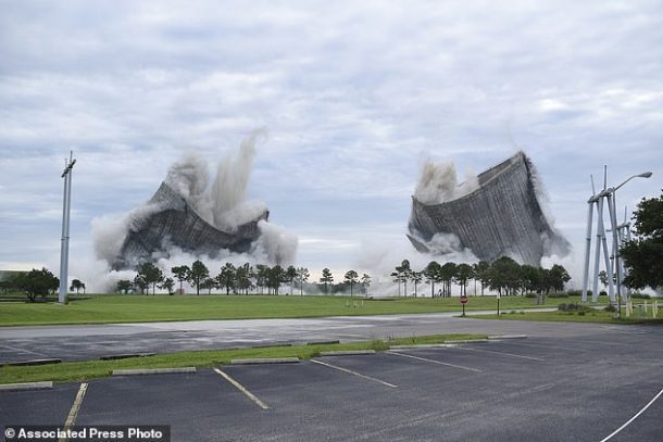 在拆除足球场时,两个冷却塔在足球场的长度上变成了灰尘。这两座塔是相同的,在杰克逊维尔的圣约翰河电力公园被拆除。塔楼倒塌后,出现了巨大的烟雾,覆盖了附近的尘土中的树木。