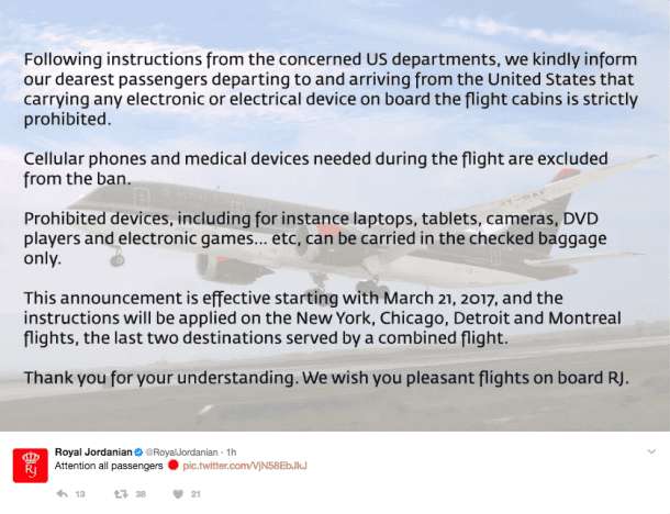 周一,《怪异的Ban》的新闻首先通过一条推文(现已从皇家约旦航空公司)删除。
