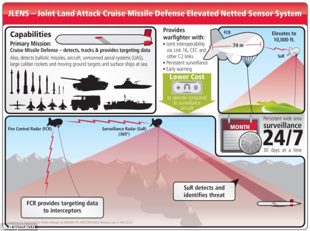 整个系统由两个搭配的80码光纤上的集成雷达系统组成。它被称为联合土地攻击导弹防御高架净传感器系统Jlens。