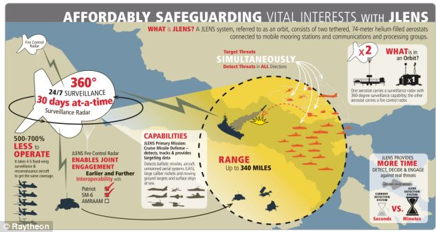 一对灯具在海拔10,000英尺的高度上飞行。他们可以在一个地方徘徊,而无需在30天内加油。因此,这使得能够采取防御措施,以防止从340英里外检测到的任何低矮的载人和无人飞机,船只,导弹发射器和坦克。jlens比运行恒定捕食者无人机便宜得多。他们无需一次专注于一个目标。根据雷神的说法,它可以“ 360度以360度追踪数百个机载和表面移动威胁”。