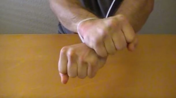 当你的手被绑住时,前后移动手腕,直到你的一只手掌能够平躺在另一只拳头上。这可能会花费你几分钟的时间,但不要放弃,继续尝试。