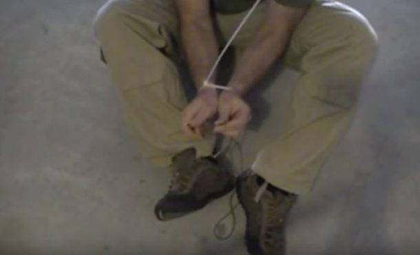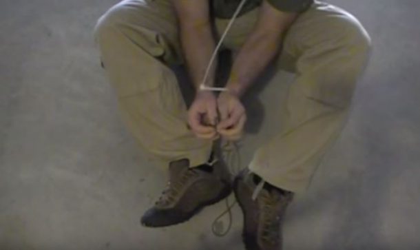 把蕾丝穿过拉链带,然后把绳子的每一端都绕成一个圈。当你把你的脚放在圈里,它会形成一个三角形。现在你已经准备好开始你的逃跑计划利用蕾丝的摩擦力。