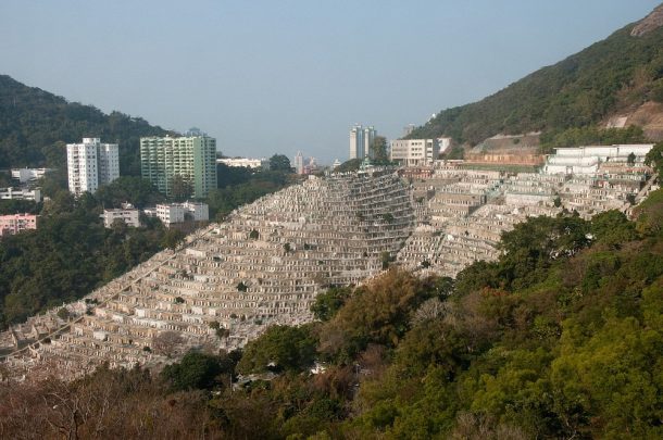 在香港,墓地建立在高坡上,以便可以节省空间。日本的一位商人为死者开设了一家酒店。死者的家属可以在等待城市的火葬场时暂时将尸体保存在那里。佛蒂斯公墓的一个真实例子是巴西桑托斯的纪念死灵图海洋。它有32个故事,并有埋葬25,000人的空间。然而,这是一栋小建筑物,于1983年建造,对“有景色”的需求增加了很多,以至于他们一直在增加地板,直到成为世界上最高的公墓。每个楼层都有150个坟墓,配备了通风系统,最多可容纳六具尸体。每三年,尸体被分解,死者的家族可以将尸体挖掘或转移到建筑物的骨折。该建筑还设有校园室,地下室,陵墓,教堂和屋顶上的小吃吧。该建筑在周围有一个花园,一个林地,泻湖和一个瀑布。