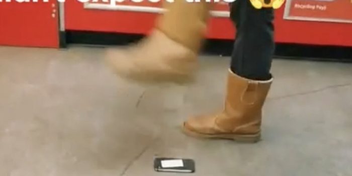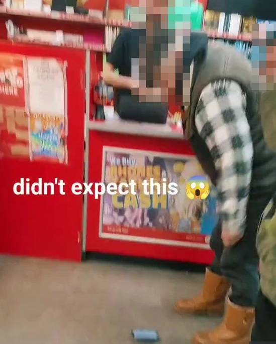 一段视频发布到TikTok显示设备上的人戳砸在角落的柜台前在商店作为一个“他妈的敲诈”。