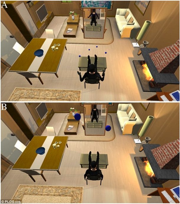 虚拟身体模仿患者的真实身体动作,任何感觉都通过振动技术复制。爱游戏ayx体育在虚拟客厅中,病人可以移动他们的腿,踢扔向他们的球。这个活动使人与他们的虚拟身体或化身身体同步。一旦出现这种情况,场景就会缩小,只留下虚拟身体坐下来,给病人一种飘浮的感觉,就像一个灵魂离开了真实的身体。