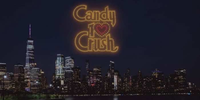 根据新闻稿,糖果粉碎了500种预设程序light-equipped无人机周四晚在纽约的天空重新创建一些热门游戏中的元素。
