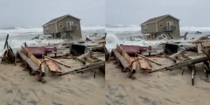 北卡罗来纳州哈特拉斯角国家海岸的一所房屋在暴风雨中坠入水中,美国国家公园管理局拍摄了这一事件的视频。