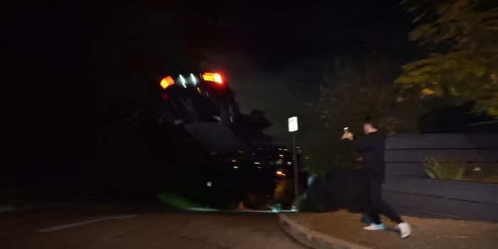 猛烈着陆后,汽车与几箱和一辆停放的汽车相撞。部署了所有安全气囊。尽管伤害在各个方面都受到了自我影响,但汽车的前端受到了重大影响。这意味着这可能是昂贵的总损失。这是一个全新的租赁特斯拉,价值约15万美元,根据陈述。