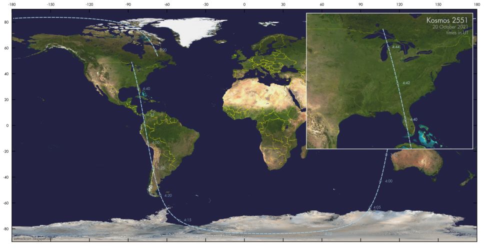 EDT上午12:43是“ Kosmos-2551的确切预测时间,并在该地区的重新输入时间不确定性窗口内。因此,我得出的结论是,Kosmos-2551的ID是稳固的,”天文学家和卫星追踪器乔纳森·麦克道尔(Jonathan McDowell)位于哈佛大学 - 史密斯森人天体物理学中心,张贴在他的Twitter上。