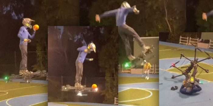 但事情并不总是按照他的计划。发布了两个新的视频Kowald Instagram帐户上发明者撞他的无人机和碎片从空中飞在试图打篮球。这表明这样的壮举是危险的。