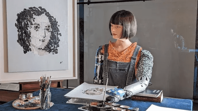 当被问及她是如何创作艺术时,AI - da回答说:“我用眼睛里的相机、人工智能算法和人工智能机械臂在画布上作画,从而创作出视觉上吸引人的图像。”