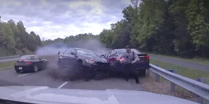 在弗吉尼亚州的一个警察将尽情他的生活现在幸运的避免危险事故后周一早上在华盛顿特区外的郊区一个失控的f - 80代宝马M3在相反的方向旅行,滑过的值和撞到一名军官与他的巡逻警车和另一辆车拉过去。
