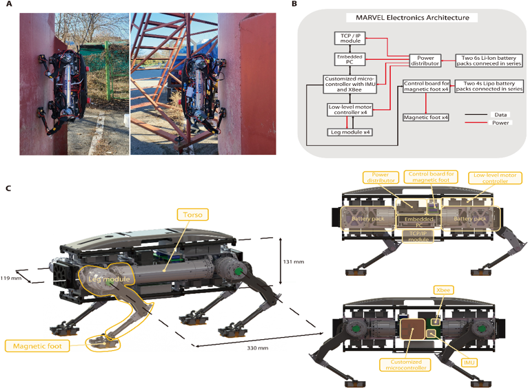 韩国科学技术研究院(KAIST)的研究人员和伊利诺伊大学的一位同事发明了一种四足机器人,它具有磁性足,能够攀爬和穿越金属墙爱游戏ayx体育壁和天花板。