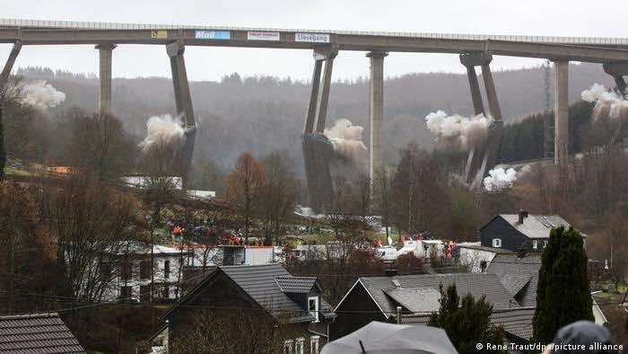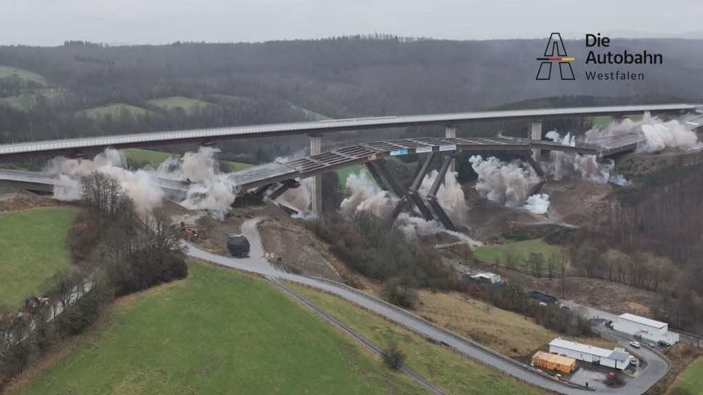 爆炸在德国建立了新的唱片,以前从未炸毁过这一高度的桥梁。这座55岁的结构在当地时间上午11点(GMT上午10点)坠毁。拆除专家迈克尔·施耐德(Michael Schneider)对此进行了行动,这座桥的16个支柱崩溃了,道路表面崩溃了。