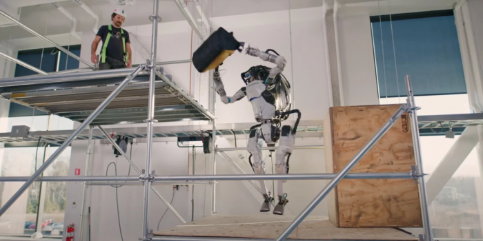 Atlas机器人中看到一个新的视频携带工具袋一些脚手架,然后扔到人类建筑工人站在一个模拟的建筑工地。阿特拉斯必须浏览网站,同时保持平衡使用其传感器和广泛的功能。